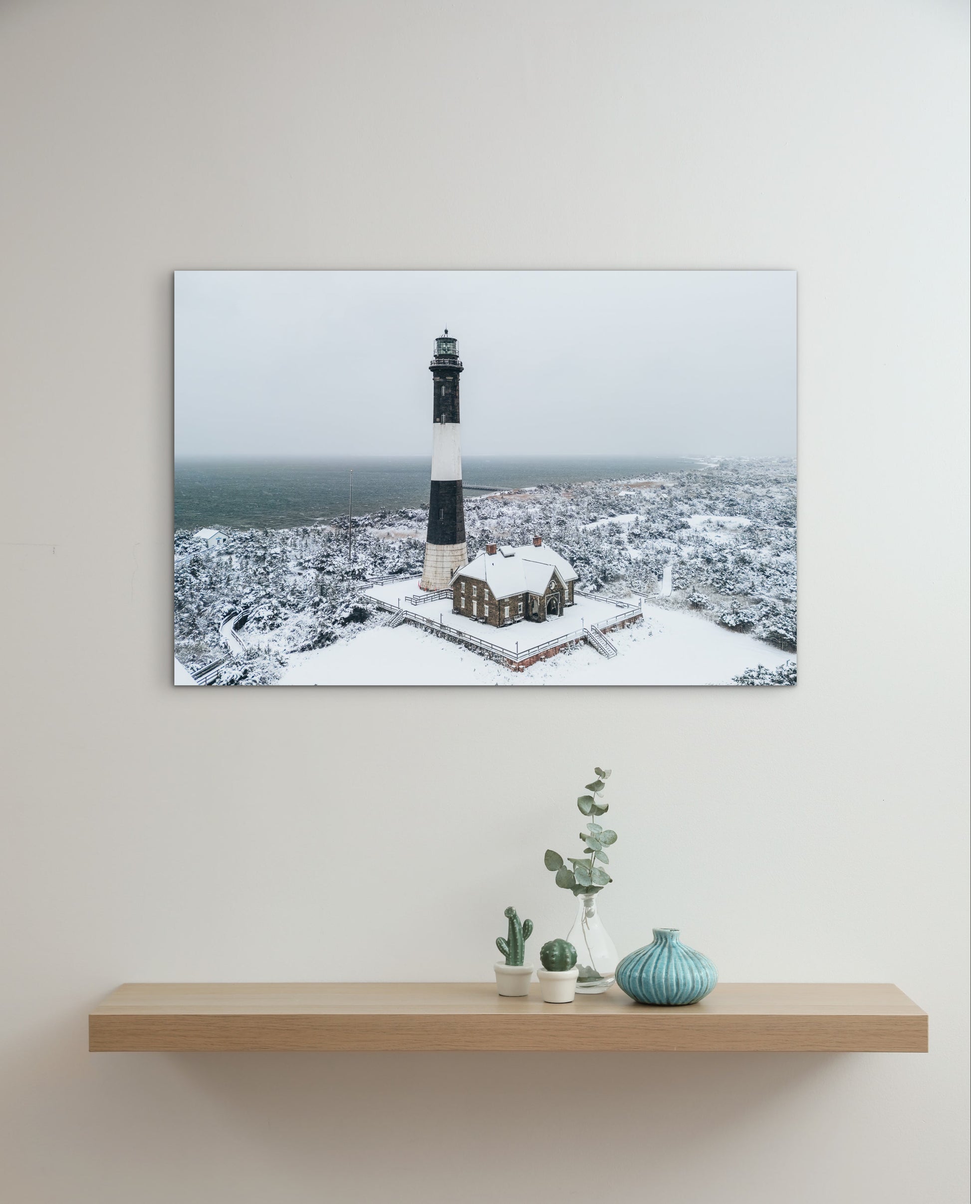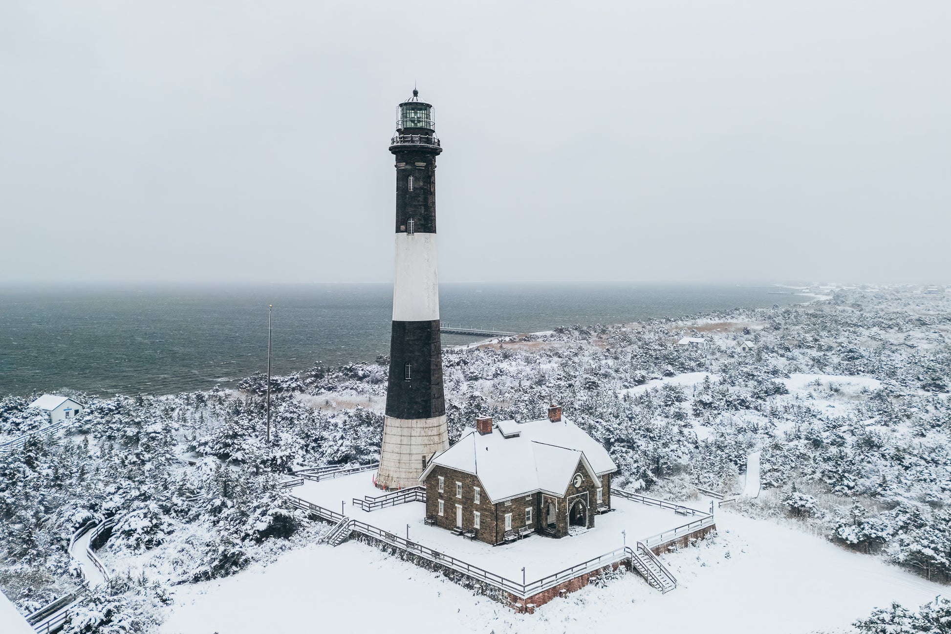 Up in the air during the back end of the snowstorm—such a unique perspective. Seeing snowflakes captured by the drone really shows just how beautiful the Fire Island Lighthouse looks with a fresh coating of snow.